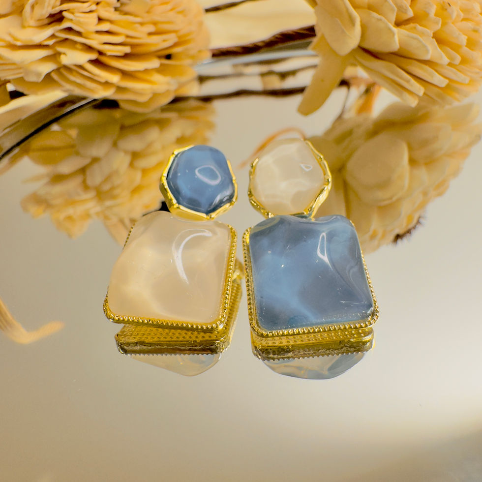 Blue & Ivory Dual-Tone Resin Drop Earrings – Gold Framed Statement Jewelry