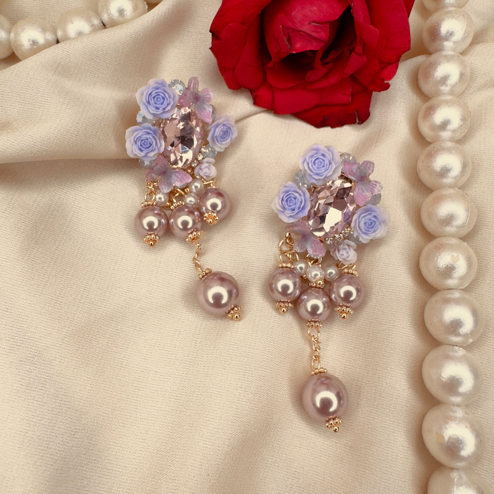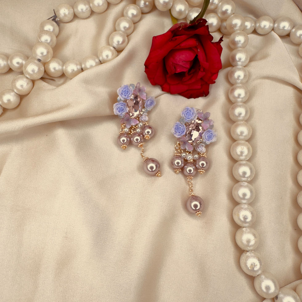 Step into a world of delicate charm with our Rose Garden Pearl Dangle Earrings. These enchanting earrings feature intricate clusters of handcrafted lavender and soft pink roses surrounding a shimmering, rose-cut crystal.